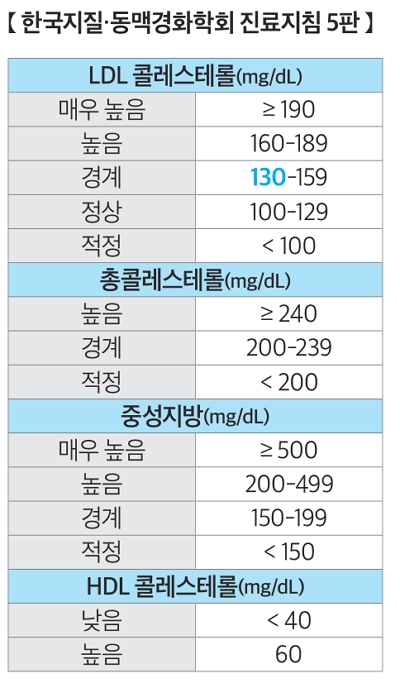 하지만 아이러니하게도 현실에서는 심혈관질환 예방을 위해 LDL 목표치를 더 하향조정하고 있다. 한국 지질·동맥경화학회에서는 2018년 진료지침 4판에서 관상동맥질환 환자의 LDL 목표치를 70 미만으로 했었는데, 2022년 개정된 진료지침 5판에서는 LDL 목표치를 55 미만으로 권고했다.